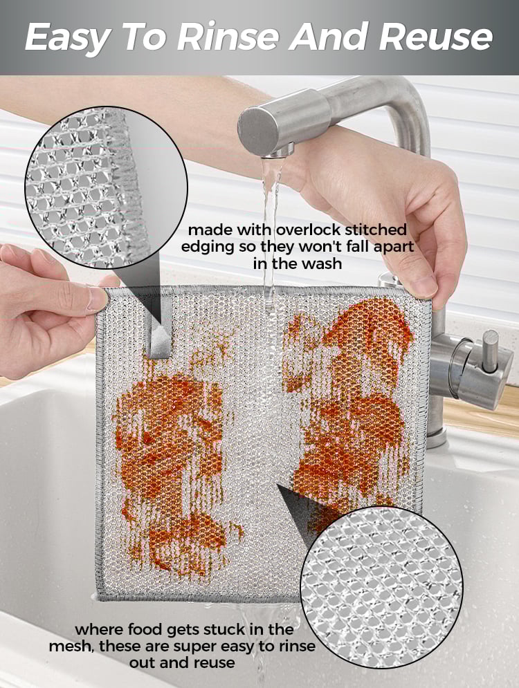 Easy To Rinse And Reuse - Unlike many mesh dish scrubbing cloths, where food gets stuck in the mesh, these are super easy to rinse out and reuse. Lasts hundreds of washings and made with overlock stitched edging so they won't fall apart in the wash.